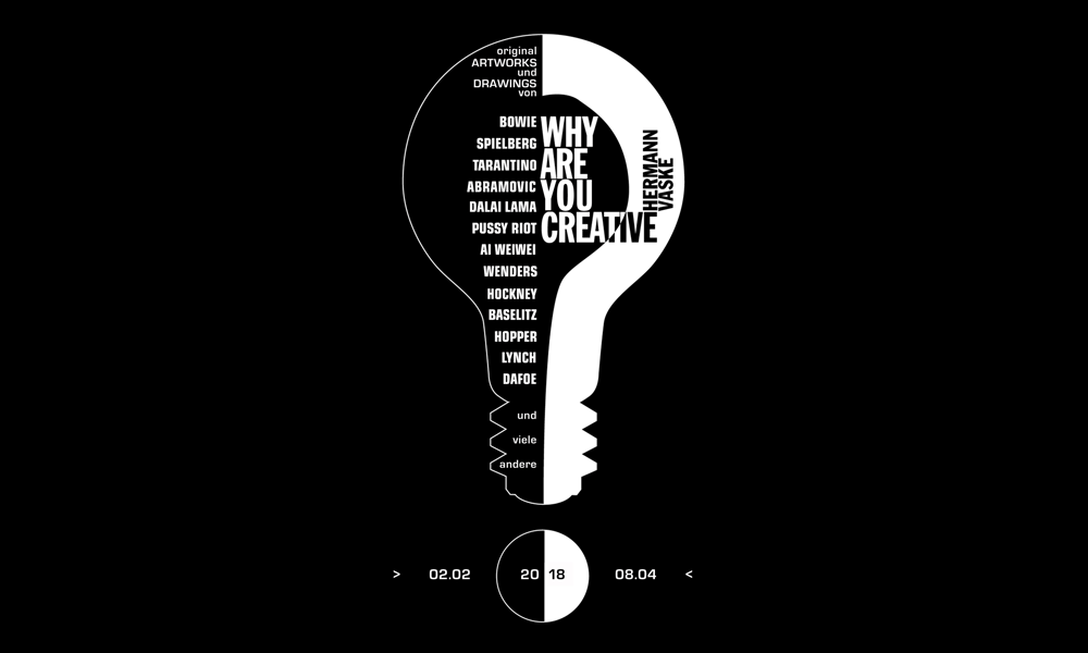 Zum 30-jährigen Jubiläum des WHY ARE YOU CREATIVE-Projekts zeigt das Museum für Kommunikation Berlin vom 2. Februar bis 8. April 2018 rund 300 Original-Zeichnungen, Werke & Interviews von Kreativen, die dem Initiator Hermann Vaske, selbst Künstler, Autor & Produzent, auf diese Frage geantwortet haben. Mit dabei sind u.a. David Bowie, Marina Abramovic, Ai Weiwei & der Dalai Lama. UND WARUM BIST DU KREATIV?